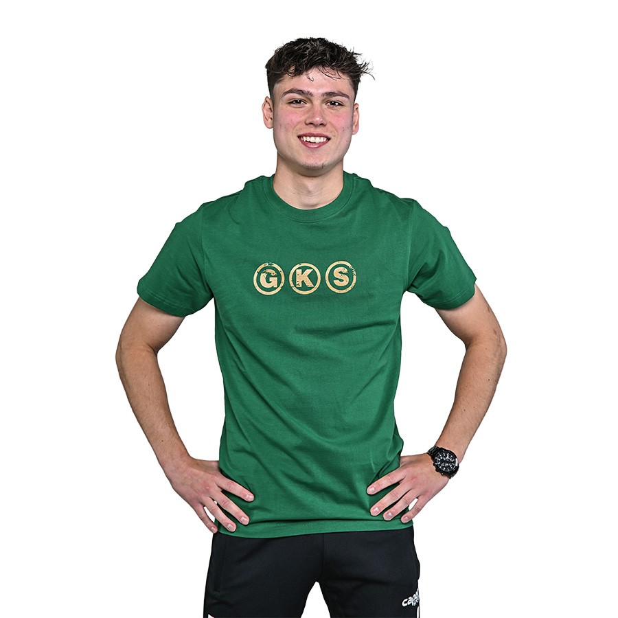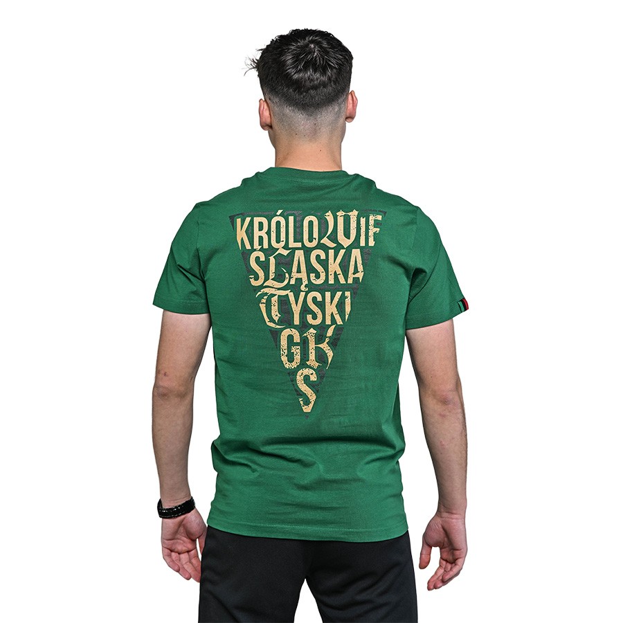T-shirt w kolorze zielonym z napisem GKS na klatce piersiowej oraz symbolem trójkąta z napisem Królowie Śląska Tyski GKS.